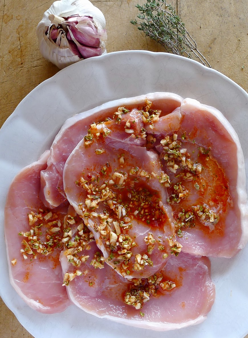 Pork loin marinates with vinegar, herbs, pimentón.